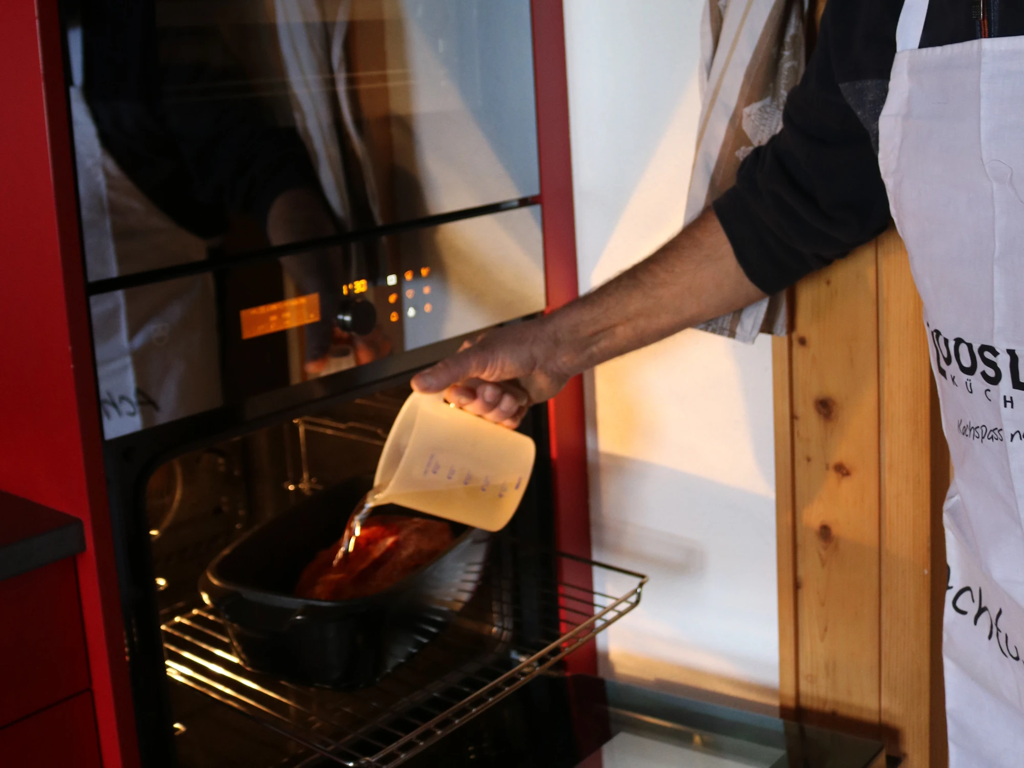 Rahm nach weiteren 15 Minuten beigeben. Braten zugedeckt 50 Minuten schmoren. Von Zeit zu Zeit mit der Flüssigkeit übergiessen.