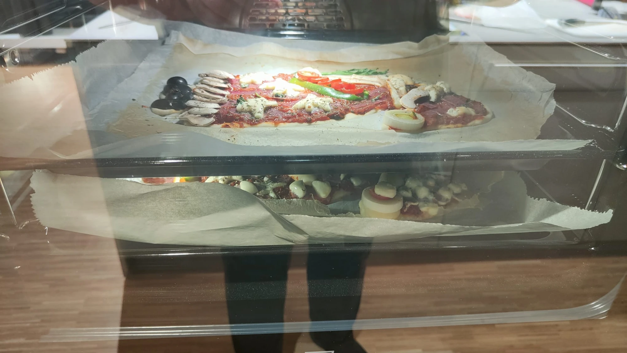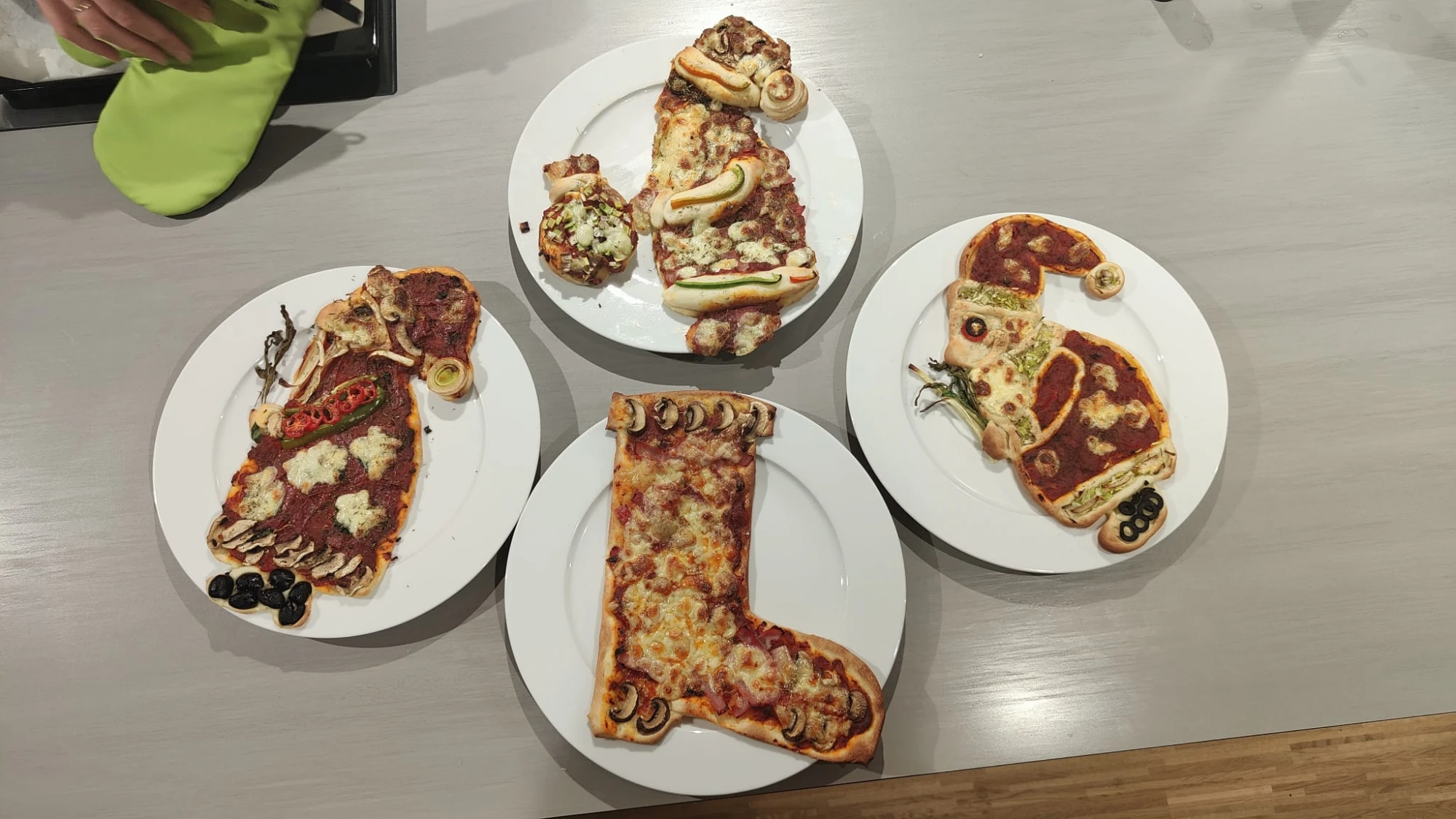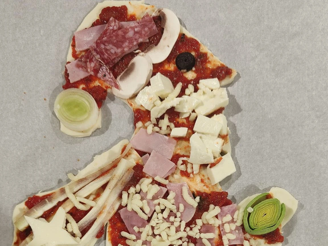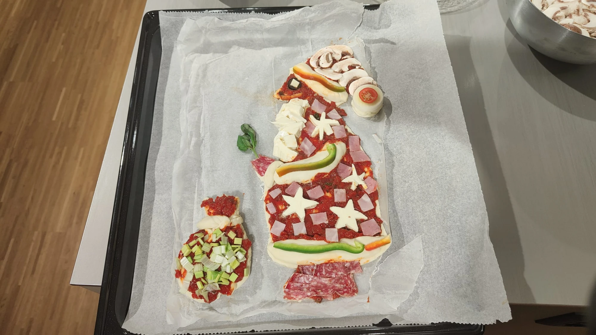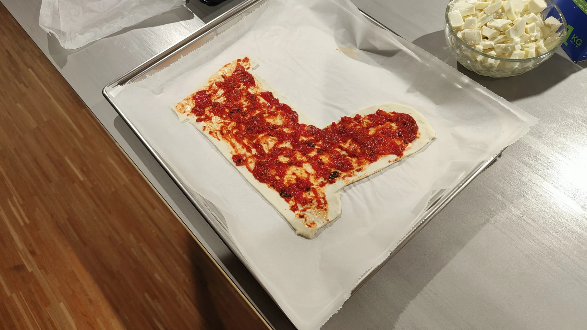 Pizzateig möglichst kalt mit einem scharfen Messer nach Vorlage ausschneiden.
