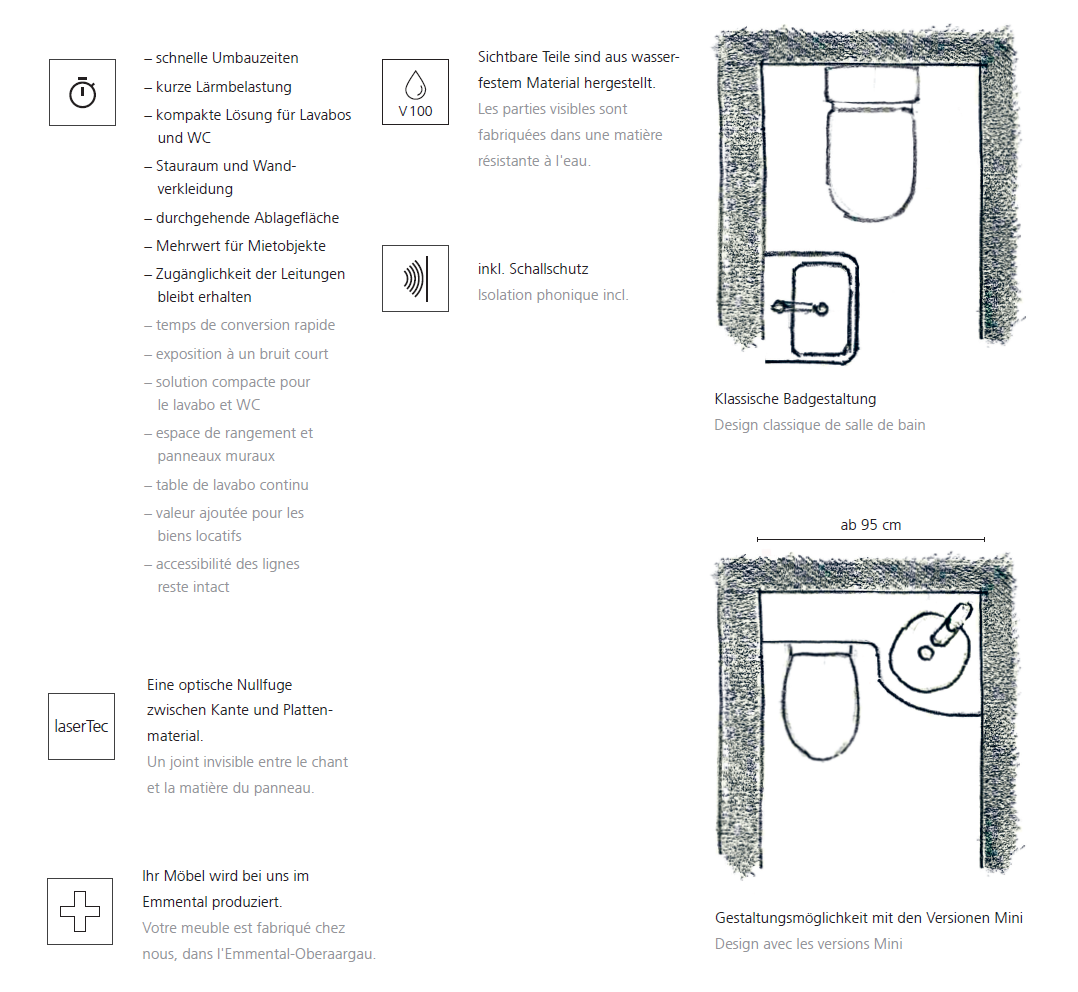 Diese Sanitärlösung eignet sich besonders für Umbauprojekte in bewohnten Gebäuden und Wohnungen. Mit Serra kann der Ersatz eines Lavabos und WCs innert Halbtagesfrist abgeschlossen werden. Dies ohne Platten- und Spitzarbeiten. Durch seinen praktischen Nutzen und seine Vielfältigkeit eignet sich Serra nicht nur für Umbauten, sondern auch für Neubauten.