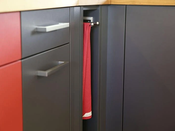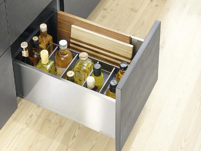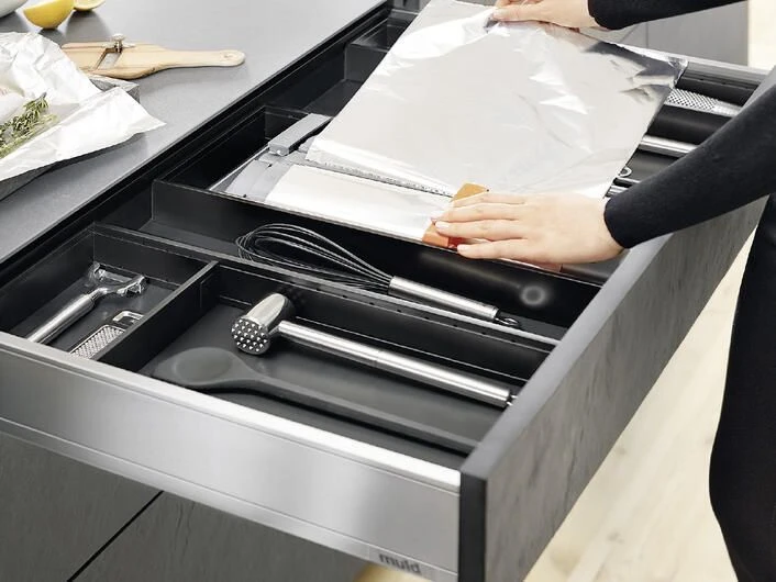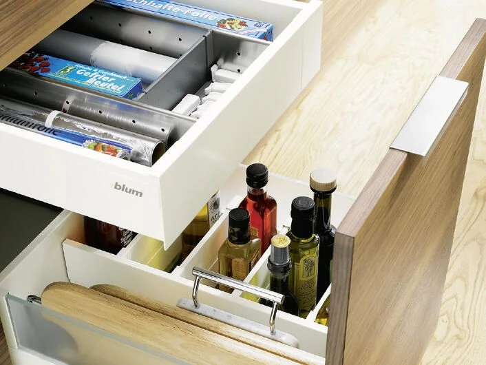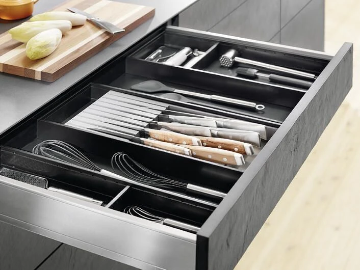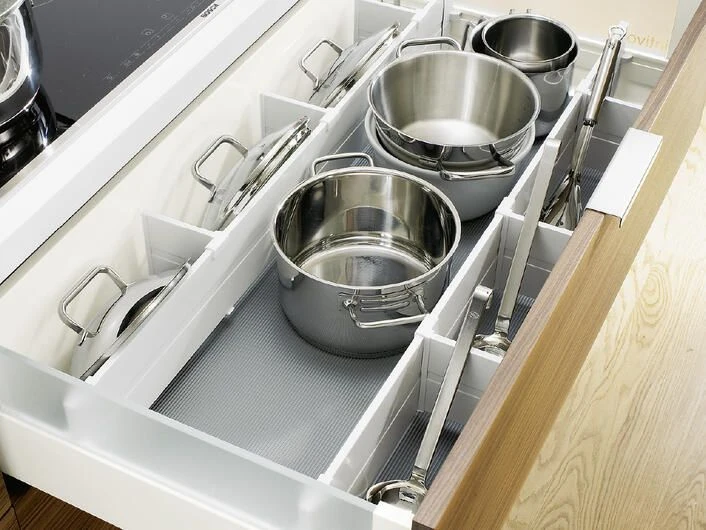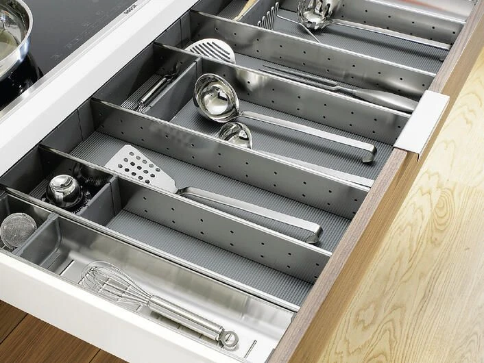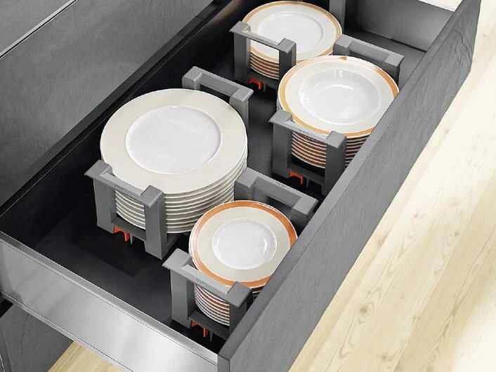 Gitter, Halterungen, Schubladeneinsätze, Trennstäbe oder Tellerstapel sorgen in jeder Schublade und jedem Schrank für Ordnung. Inhalte geraten nicht durcheinander oder in ungewollte Schieflage. Durch cleveres Zubehör kann Platz gespart werden, indem jeder Inhalt seinen fixen Standort hat.