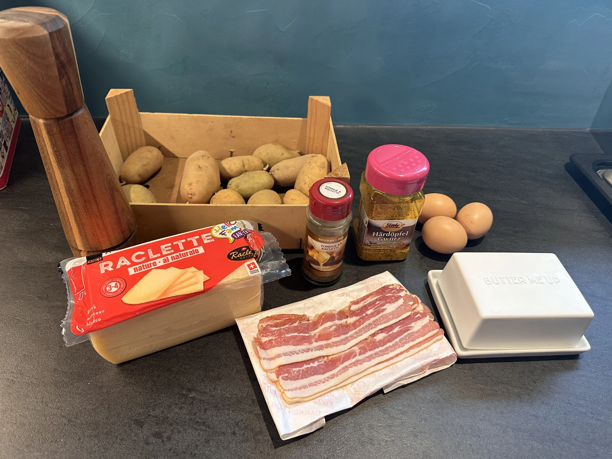 Raclettekäse halbieren, anschliessend je 2 Stücke mit einer Tranche Speck einwickeln und auf die Plätzchen verteilen. Mit der restlichen Kartoffelmasse bedecken und gut andrücken.