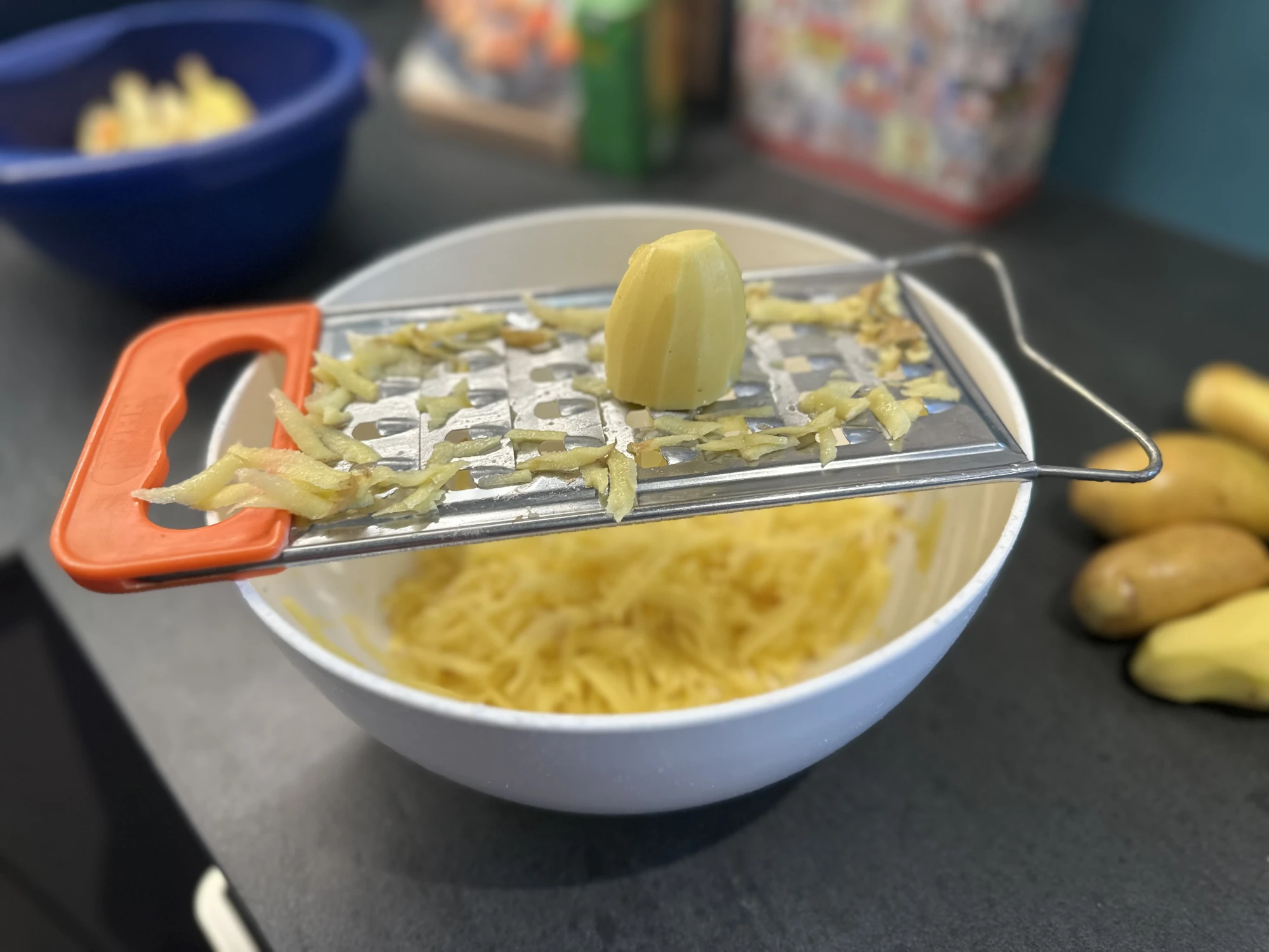 Kartoffeln an der Röstiraffel raffeln, mit den Eiern zusammen in einer Schüssel gut mischen und würzen.