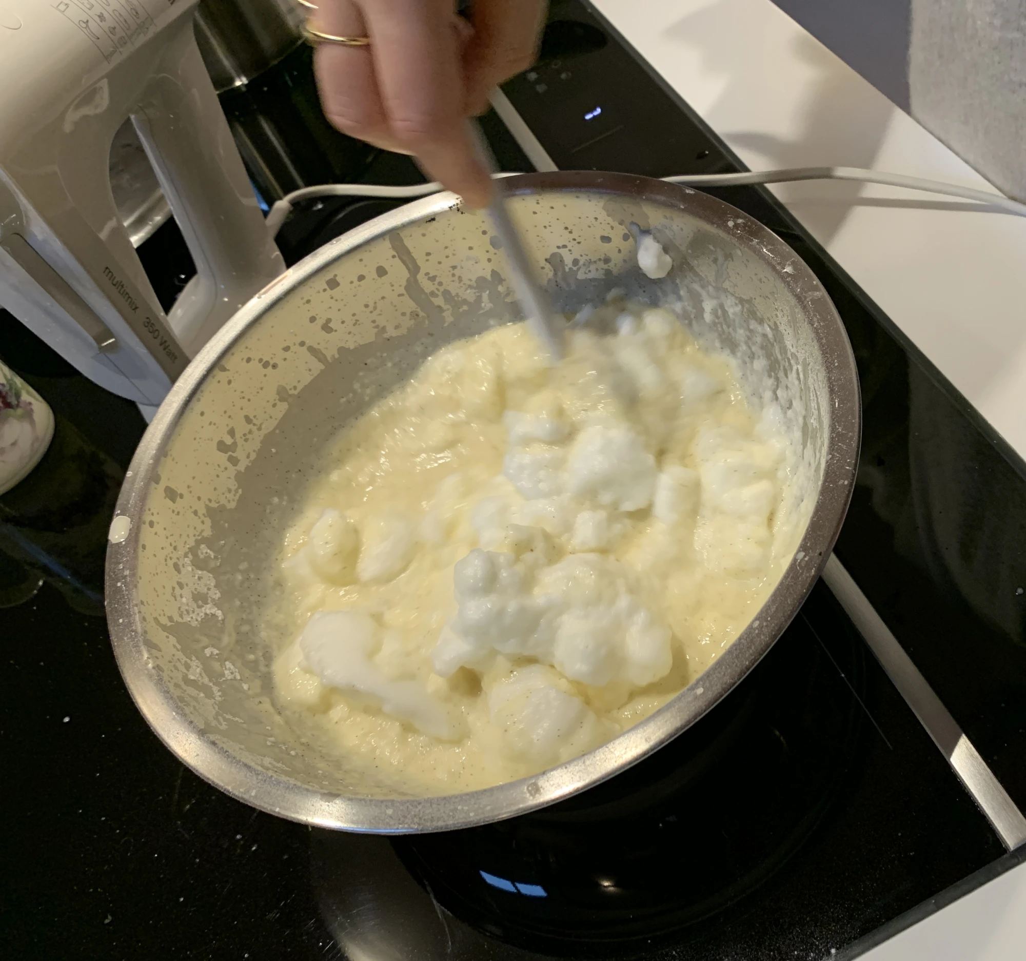 2 Eiweiss steif schlagen und unter die Masse ziehen.