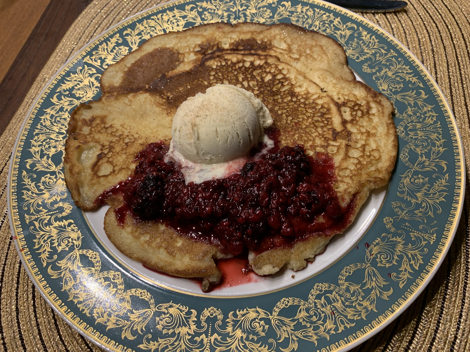 Omelette mit heissen Beeren und Vanilleglace anrichten.