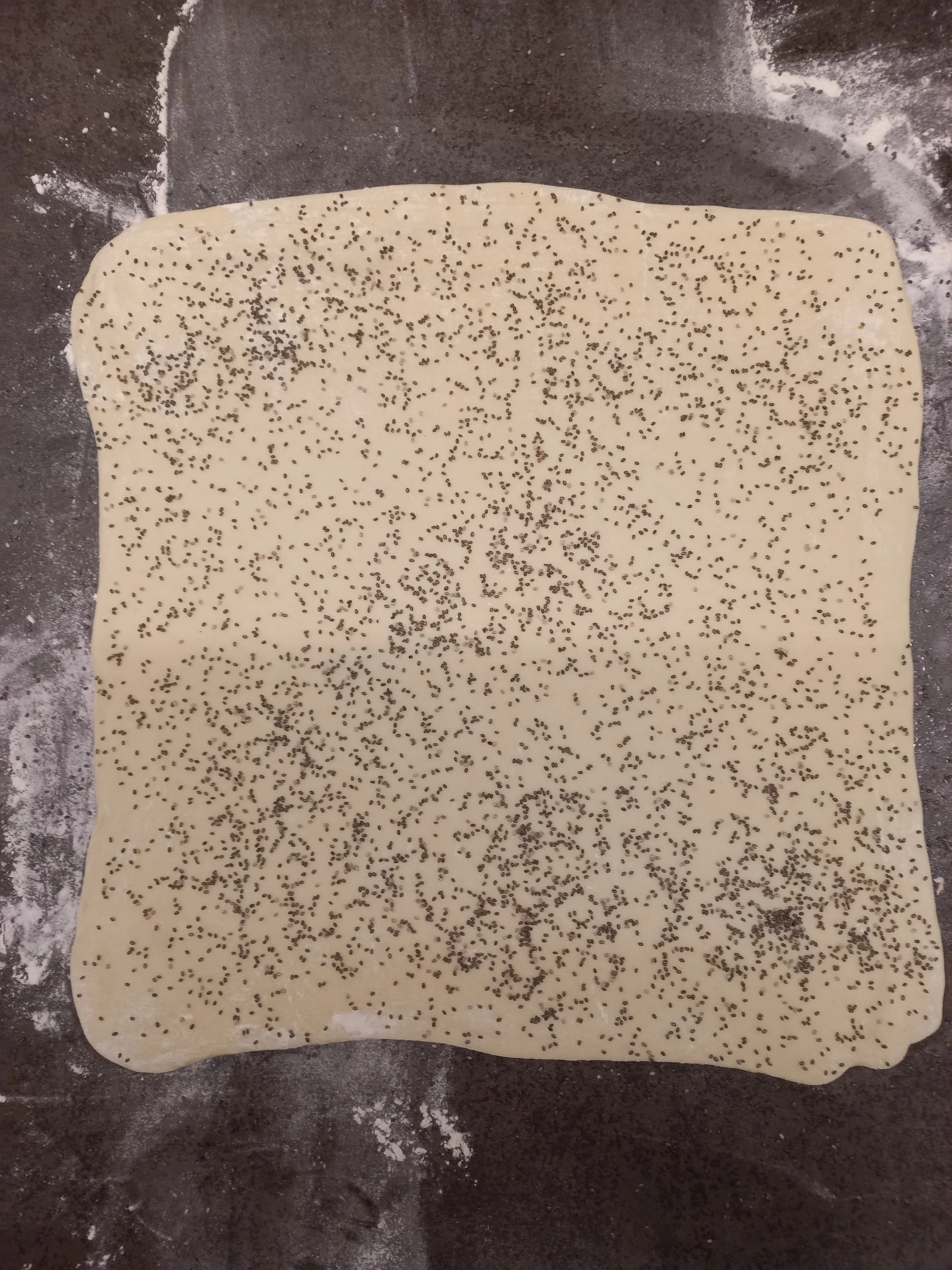 Blätterteig auf Mehl auswallen. Am Schluss gleichmässig Mohnsamen darüber streuen und mit dem Wallholz einwallen.