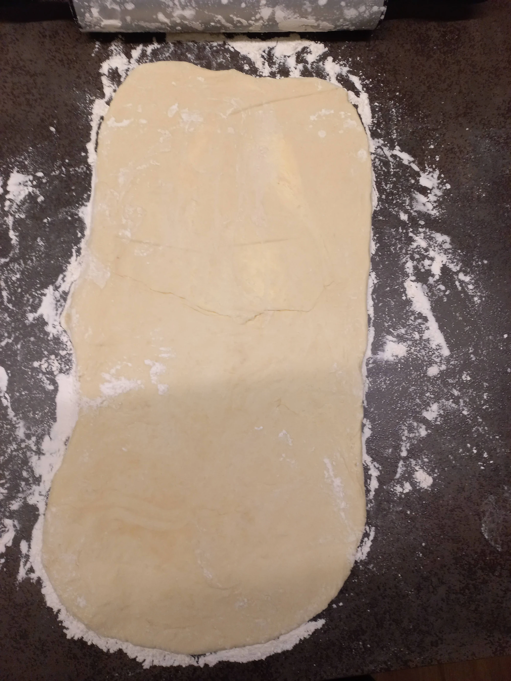 Den Teig auf einer gut bemehlten Fläche rechteckig zurecht drücken und dann längs ausrollen auf 1 cm.