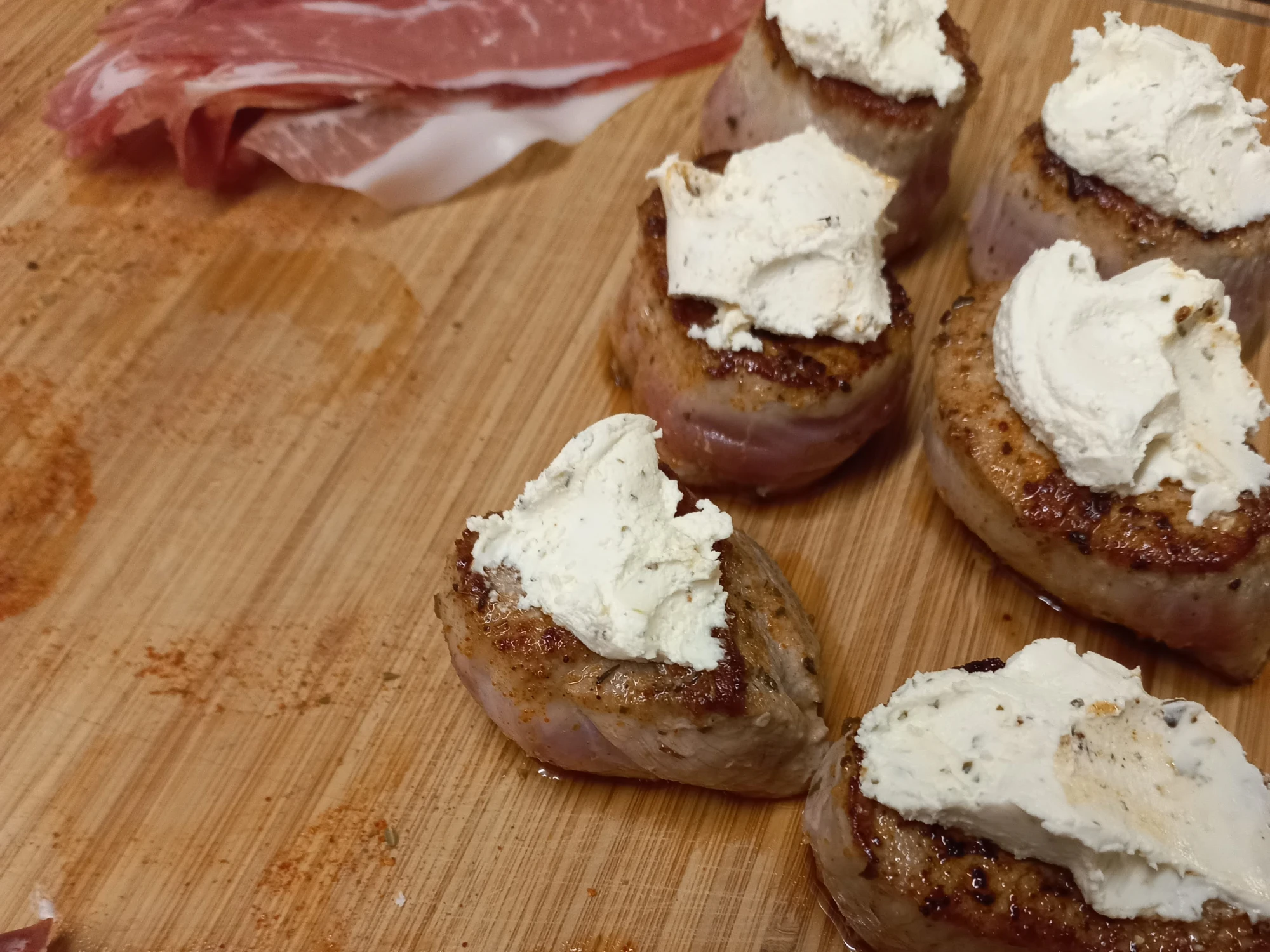 Medaillons mit Cantadou bestreichen und mit Rohschinken umwickeln.