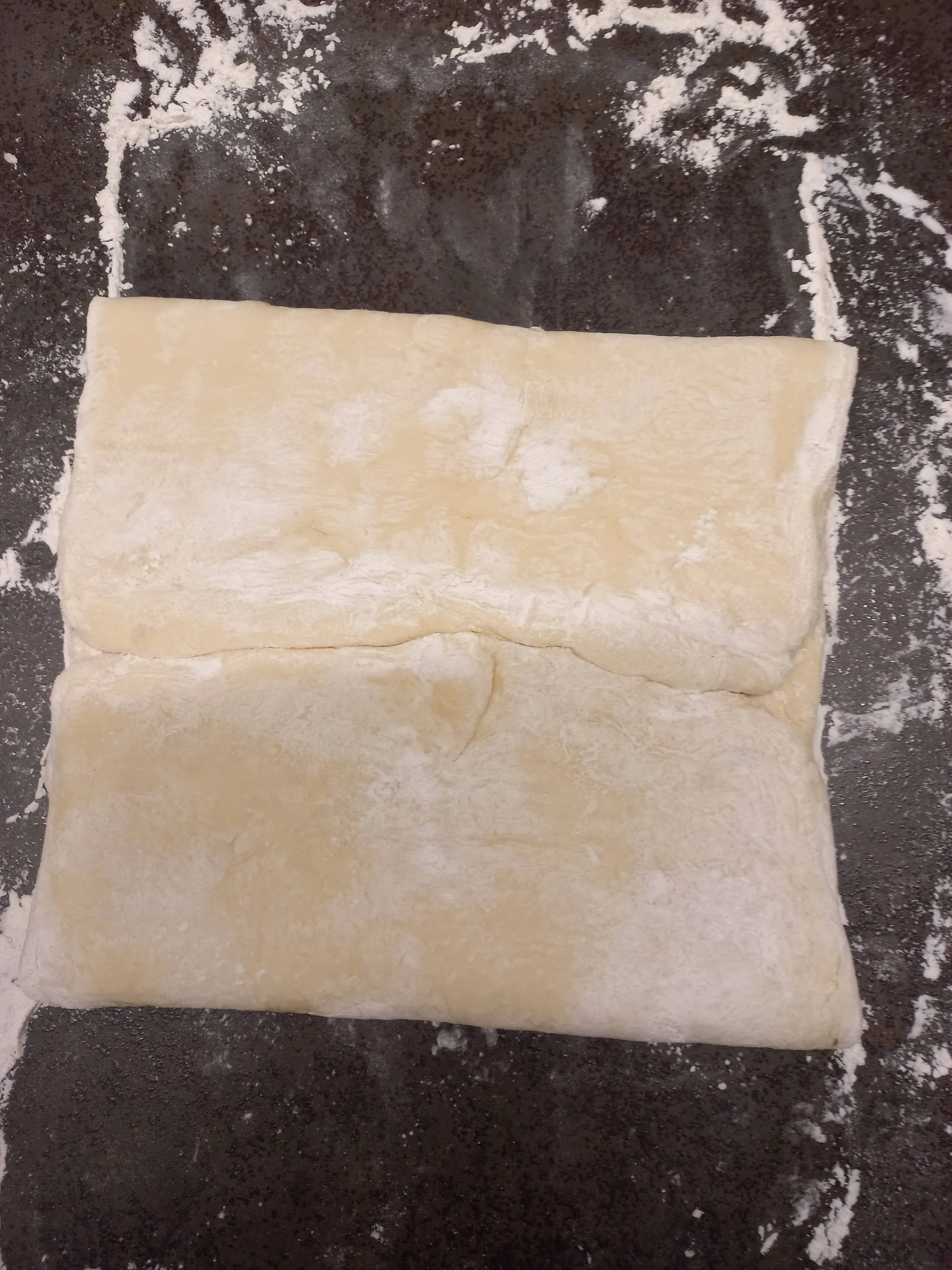 Teig in Folie einwickeln und 15 Min in Tiefkühler. Dann den Teig wieder auf bemehlter Fläche längs ausrollen auf 1cm Dicke. Falten wie beim ersten Mal und ab in den TK.