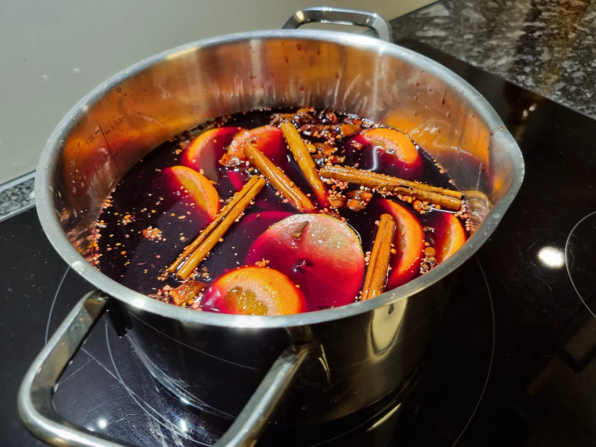 Rotwein in einem Topf erhitzen (nicht kochen). Fruchtsaft und Gewürze hinzugeben und in der heissen Flüssigkeit ca. 20min ziehen lassen.