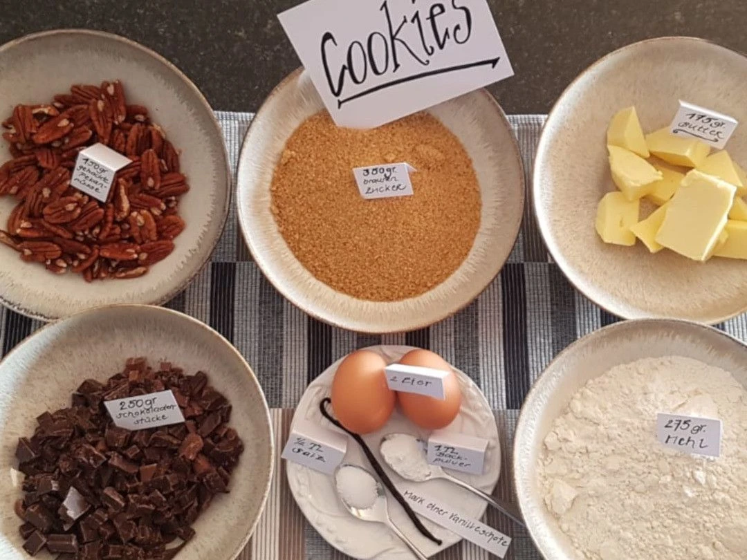 Zum Schluss Pekannüsse und Schokoladenstücke darunter rühren.