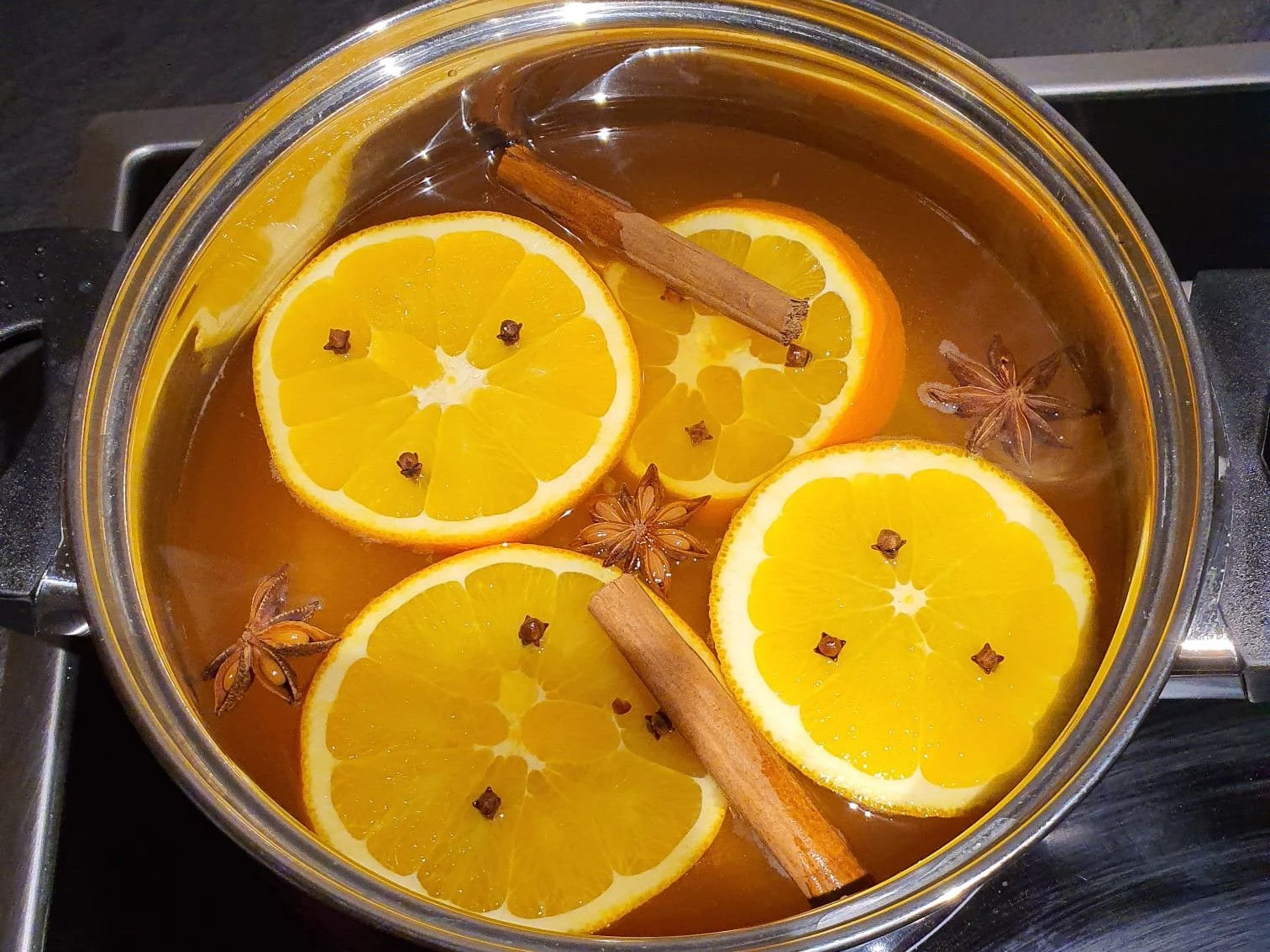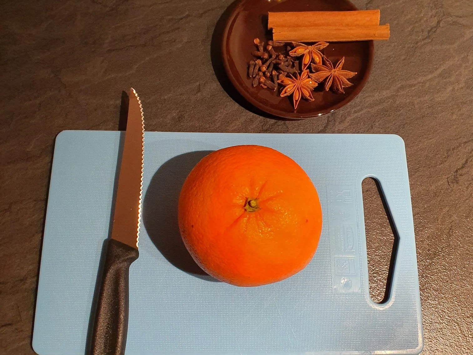 1.Schritt: Apfelsaft in einen grossen Topf geben. Die Orangen in 1-2 cm dicke Scheiben schneiden und je 2-3 Nelken in die Scheiben stecken.
