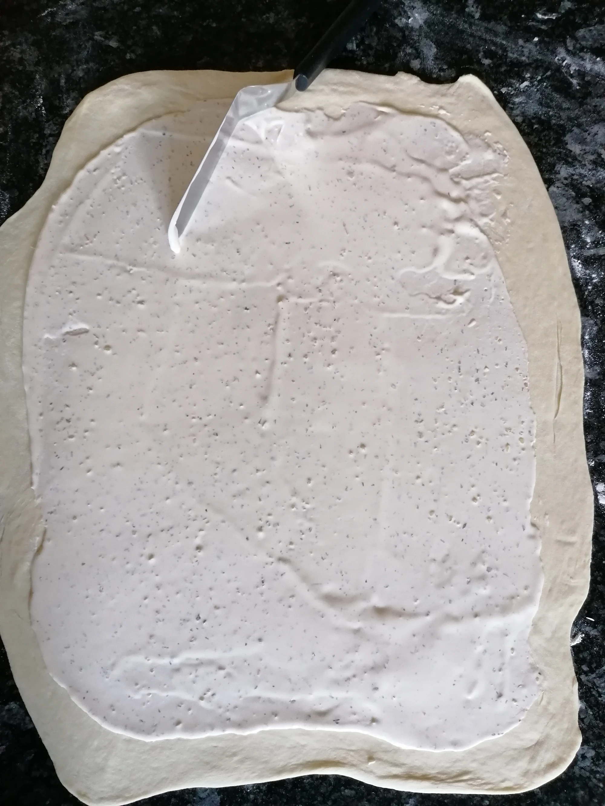 Teig in zwei Hälften aufteilen und dann auf ein wenig Mehl rechteckig ca. Backblechgrösse ausrollen.