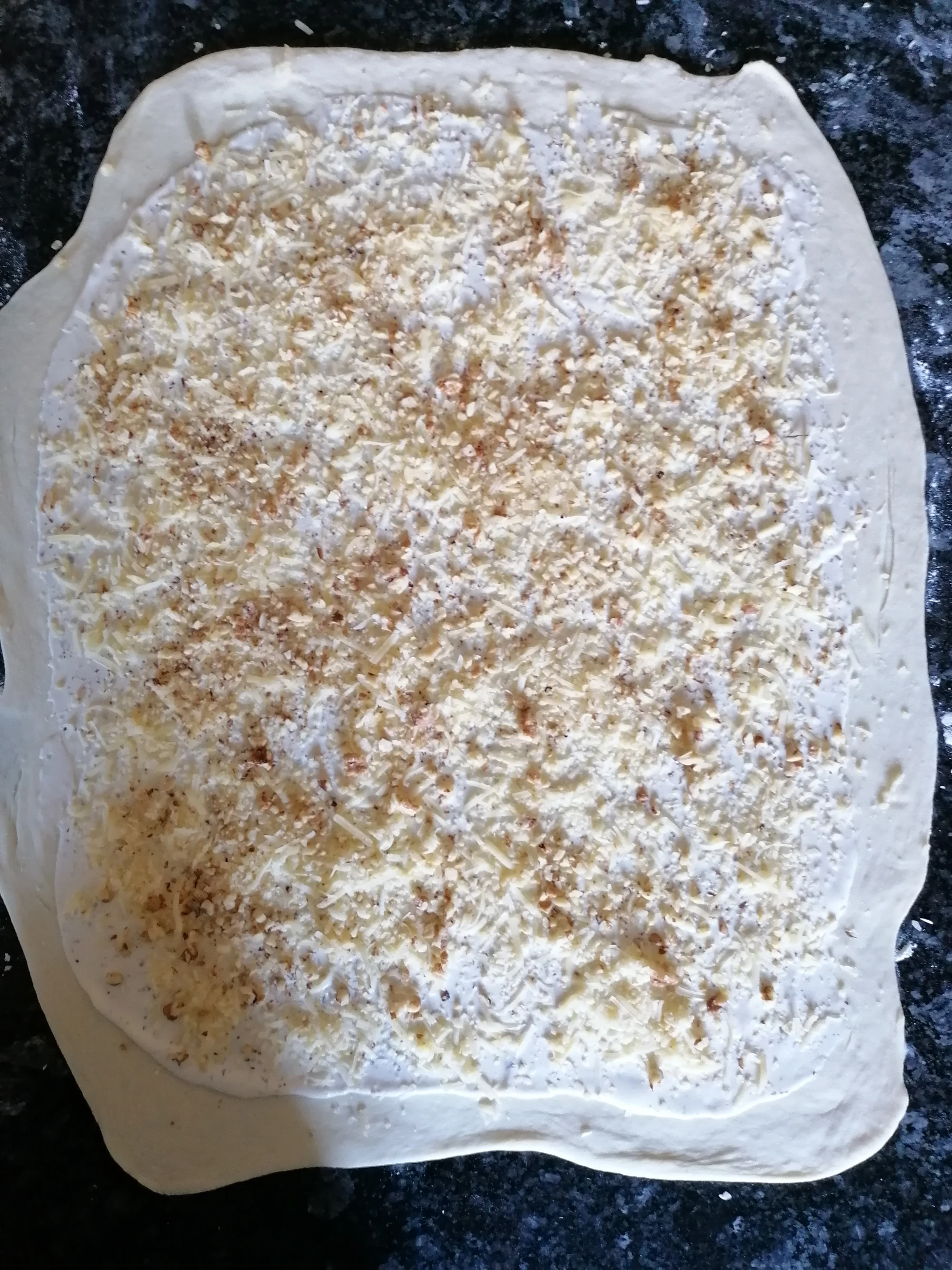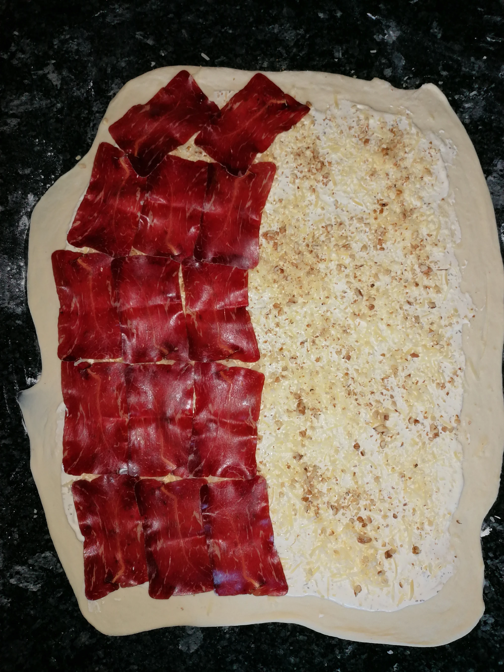 Teig mit Crème Fraîche bestreichen, anschliessend Reibkäse und die gehackten Baumnüsse darauf verteilen. Die Bündnerfleisch Tranchen werden am Schluss noch über alles verteilt.