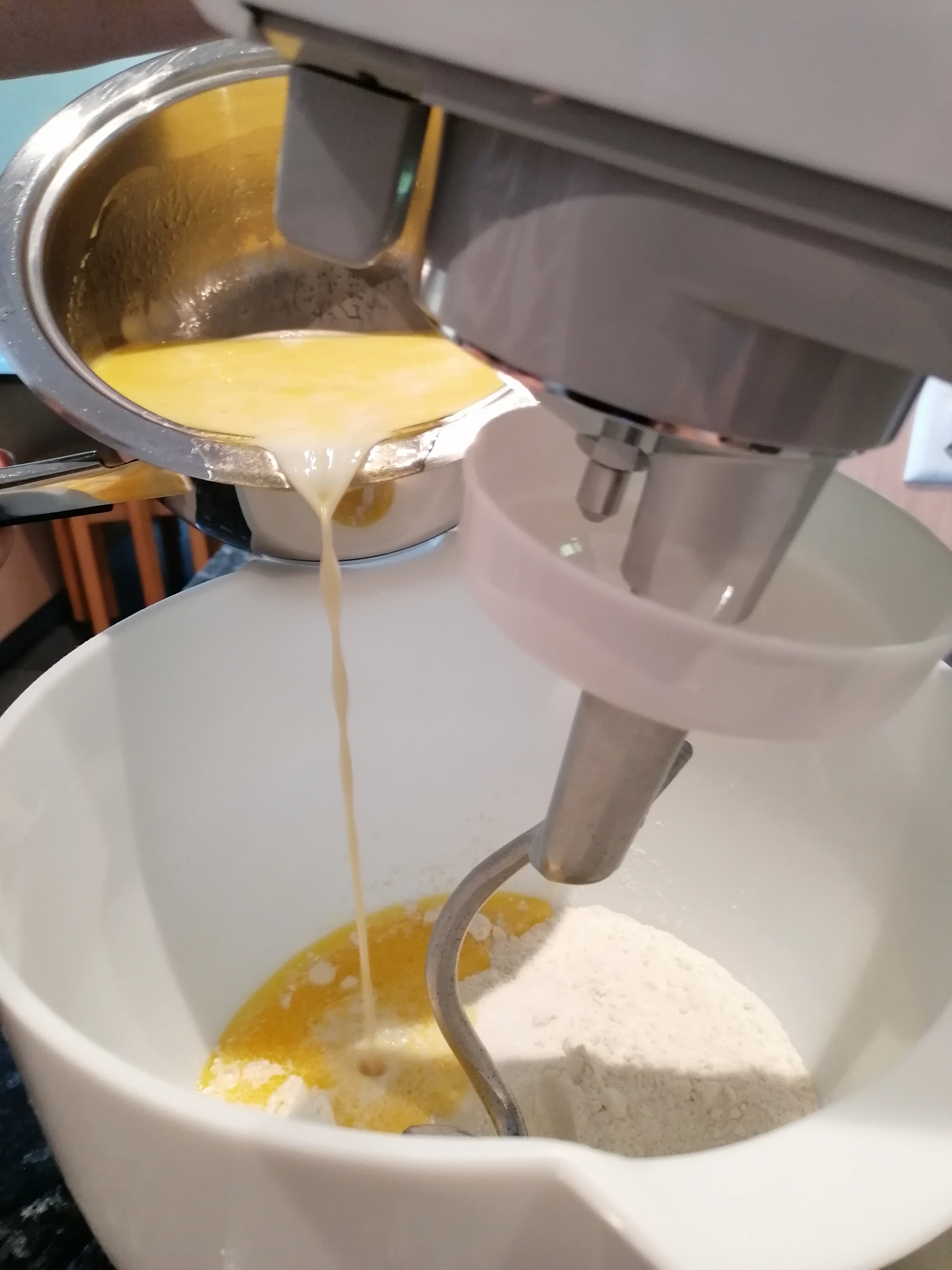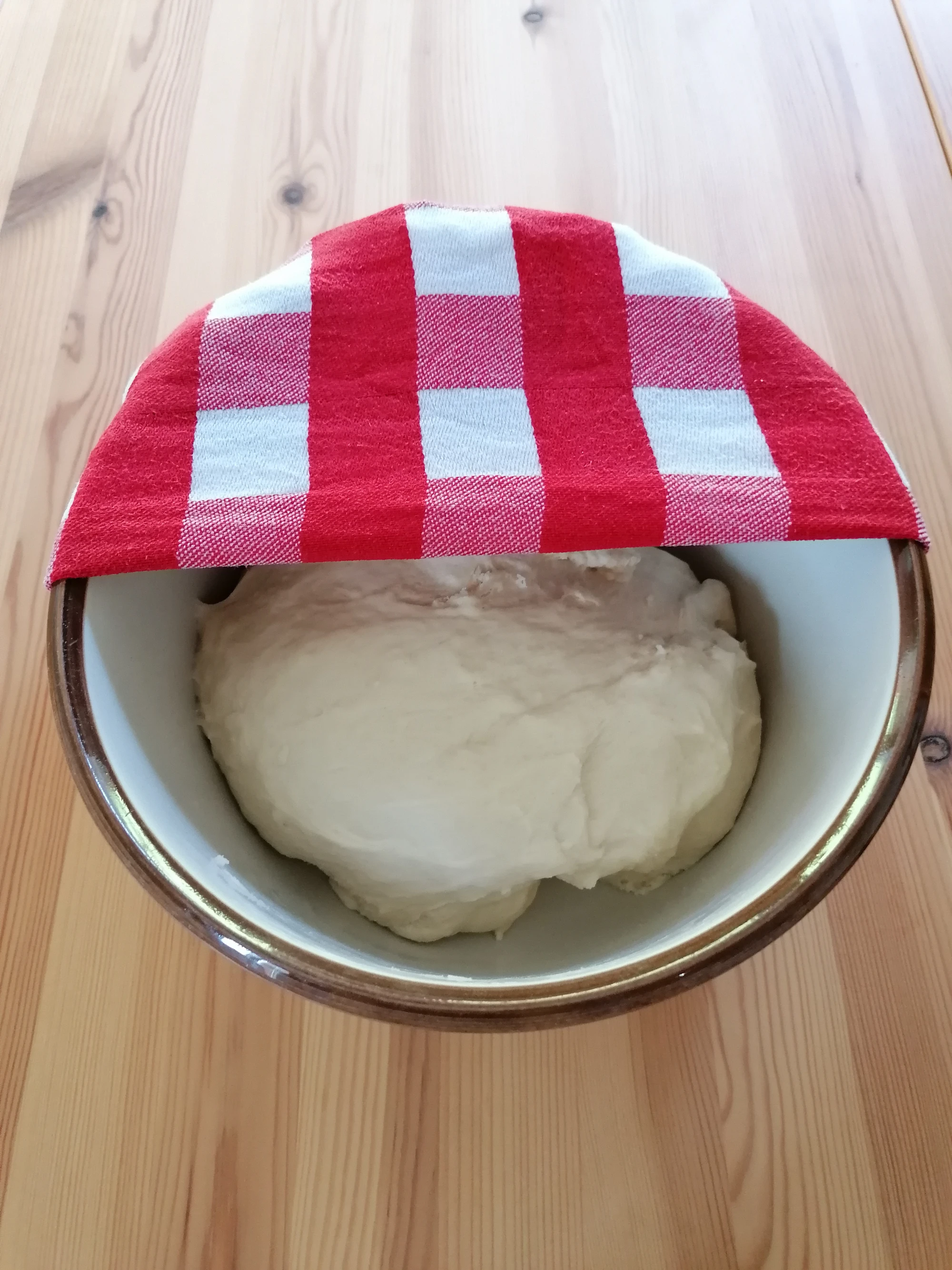 Die erwärmte Flüssigkeit unter das Mehl rühren, bis ein weicher, glatter Teig entsteht. Teig mit nassem Tuch zudecken und bei Raumtemperatur ca. um das Doppelte aufgehen lassen. (ca. 1-2h)