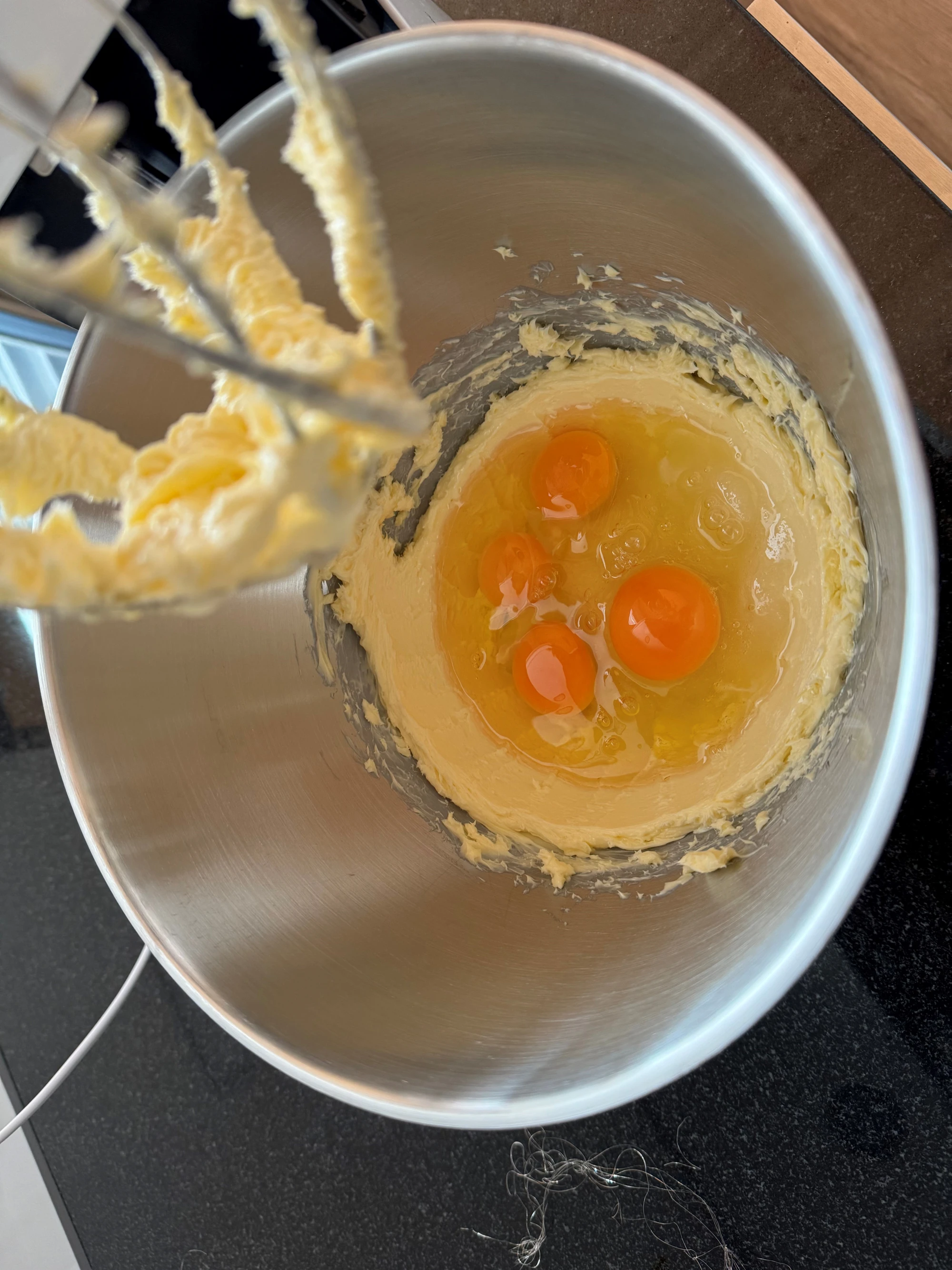 Zucker, Eier und Rahm zugeben, rühren, bis die Masse hell ist.