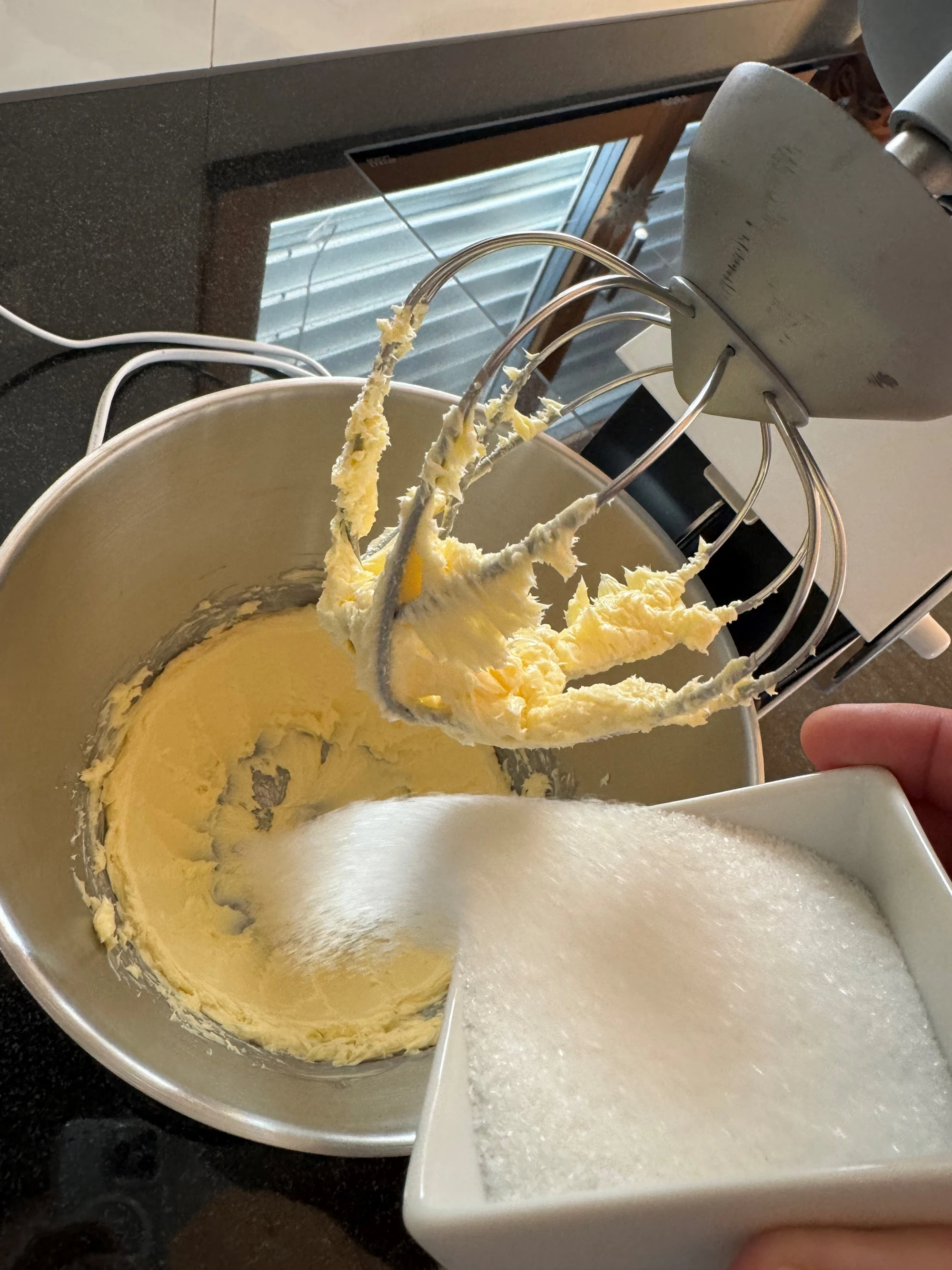 Butter in die Schüssel geben und rühren bis sich Spitzchen bilden.