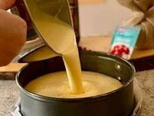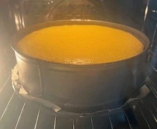 4. Käsekuchen im heißen Ofen rund 60 Minuten backen. Dann den Ofen ausschalten und den Kuchen bei leicht geöffneter Ofentür (Kochlöffel dazwischen stecken) 20 Minuten auskühlen lassen. Herausnehmen und auskühlen lassen, dann aus der Form lösen.