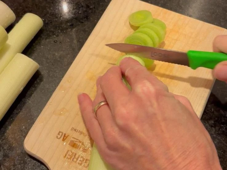 Lauch in ca. 5 mm dicke Ringe, Landjäger in feine Scheiben schneiden. Dörraprikosen in Würfeli schneiden.